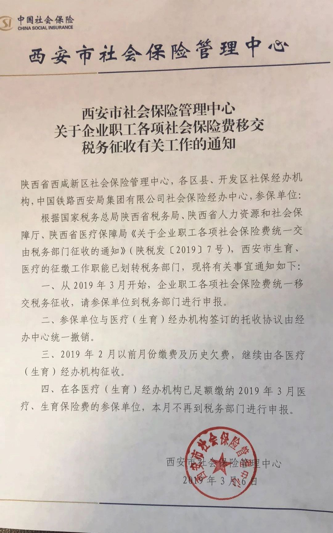 3月6日,一份《西安市社会保险管理中心 关于企业职工各项社会保险费移交税务征收有关工作的通知》流出,显示:2019年3月起,企业职工各项社会保险费统一移交税务征收,参保单位需到税务部门进行申报!